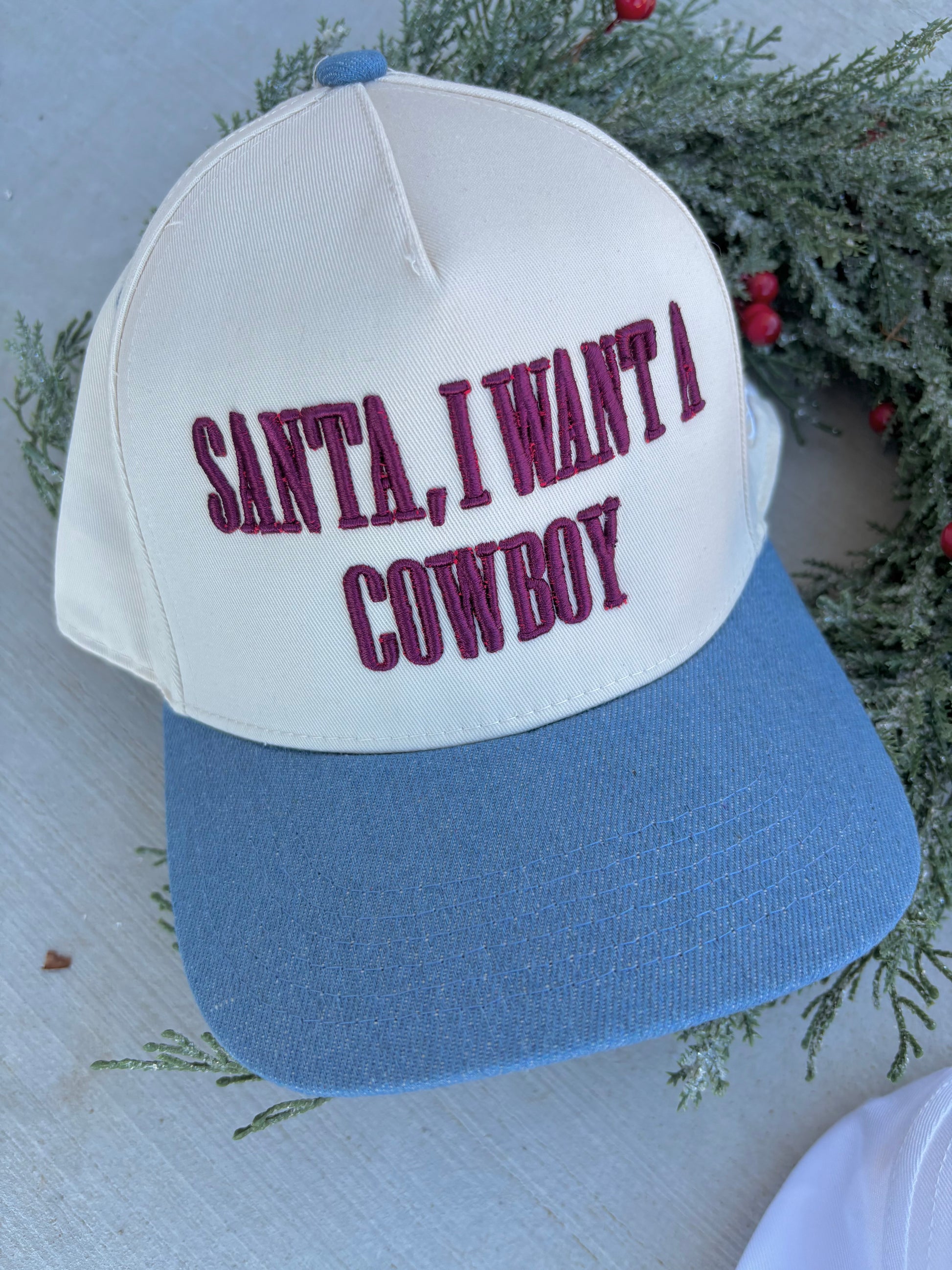 “Santa, I Want a Cowboy” puff embroidered in deep red thread
